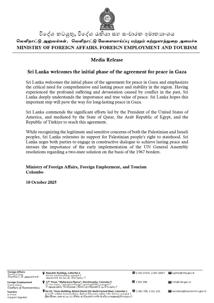 Sri Lanka welcomes the initial phase of the agreement for peace in Gaza