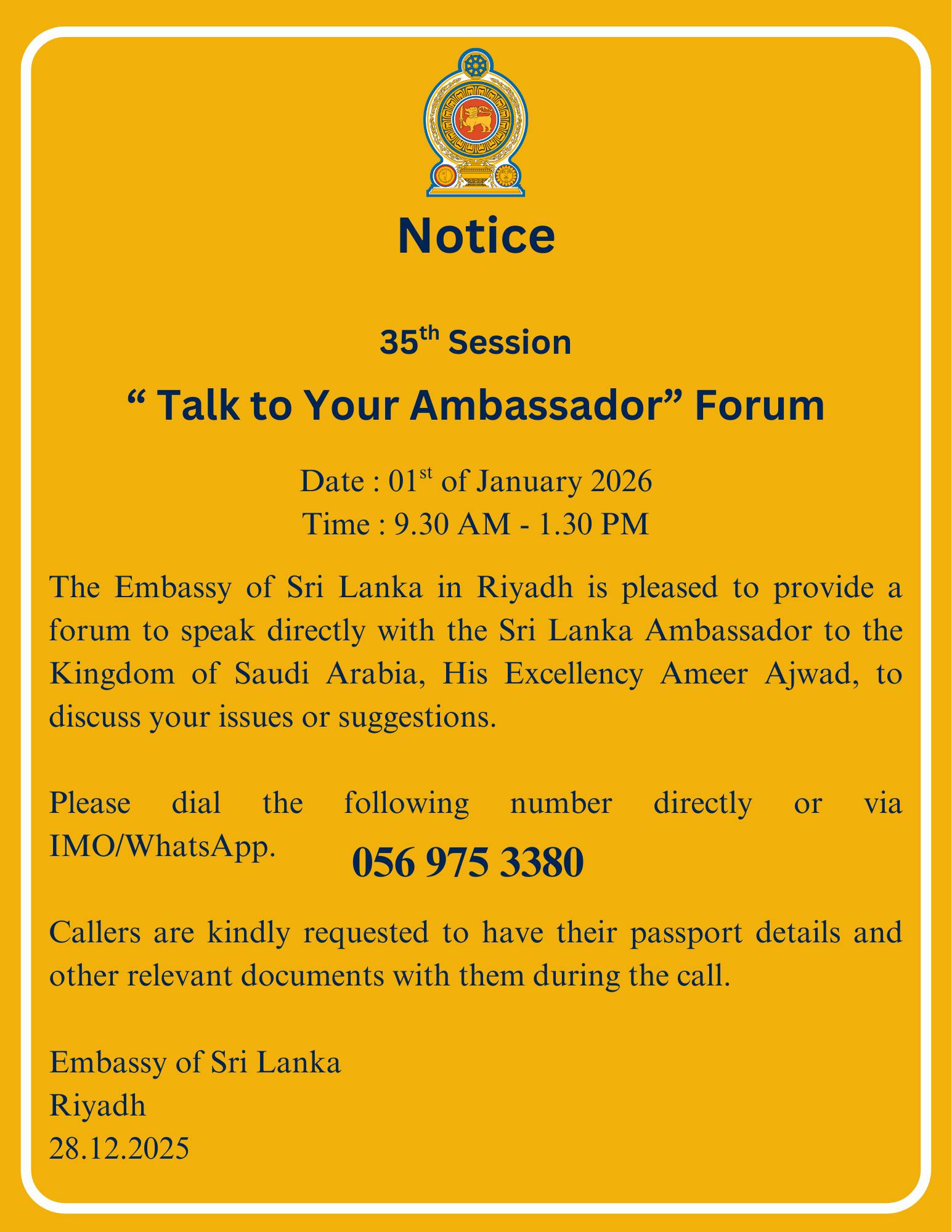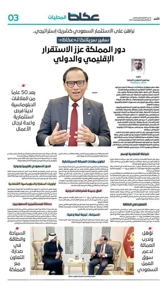 𝐄𝐱𝐜𝐥𝐮𝐬𝐢𝐯𝐞 𝐢𝐧𝐭𝐞𝐫𝐯𝐢𝐞𝐰 𝐛𝐲 𝐇.𝐄. 𝐎𝐦𝐚𝐫 𝐋𝐞𝐛𝐛𝐞 𝐀𝐦𝐞𝐞𝐫 𝐀𝐣𝐰𝐚𝐝, 𝐀𝐦𝐛𝐚𝐬𝐬𝐚𝐝𝐨𝐫 𝐨𝐟 𝐒𝐫𝐢 𝐋𝐚𝐧𝐤𝐚 𝐭𝐨 𝐭𝐡𝐞 𝐊𝐢𝐧𝐠𝐝𝐨𝐦 𝐨𝐟 𝐒𝐚𝐮𝐝𝐢 𝐀𝐫𝐚𝐛𝐢𝐚 𝐟𝐨𝐫 𝐎𝐤𝐚𝐳 𝐀𝐫𝐚𝐛𝐢𝐜 𝐃𝐚𝐢𝐥𝐲 𝐍𝐞𝐰𝐬𝐩𝐚𝐩𝐞𝐫.