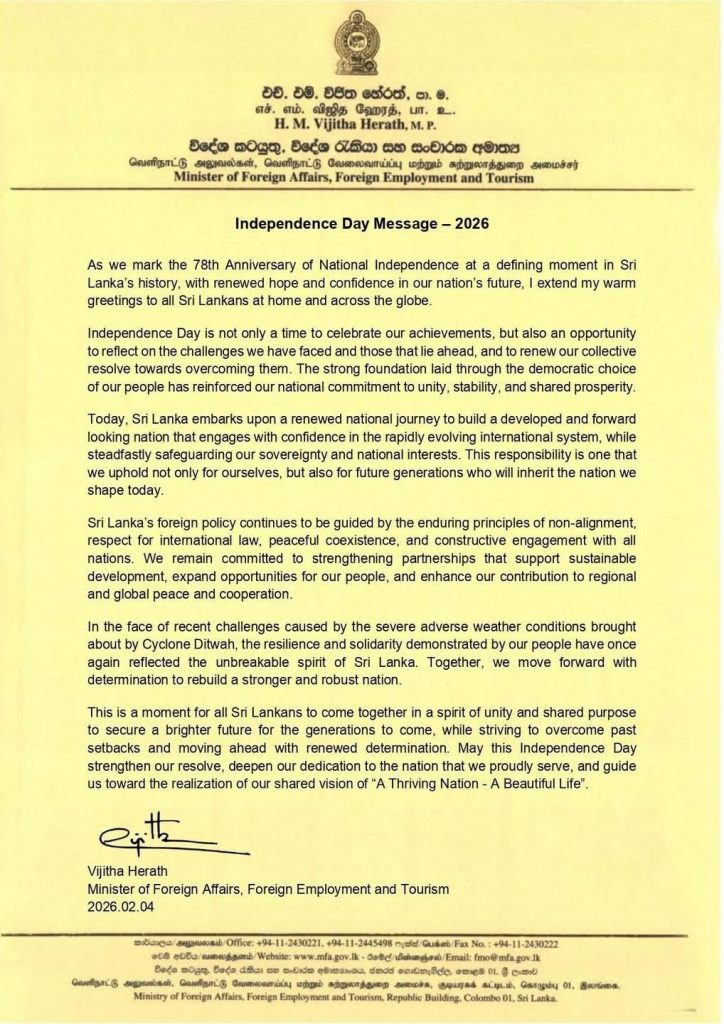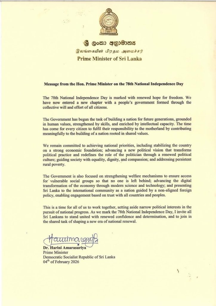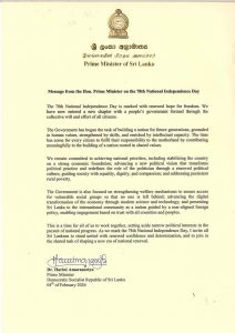 Message of the Hon. Prime Minister of Sri Lanka on the 78th Independence Day