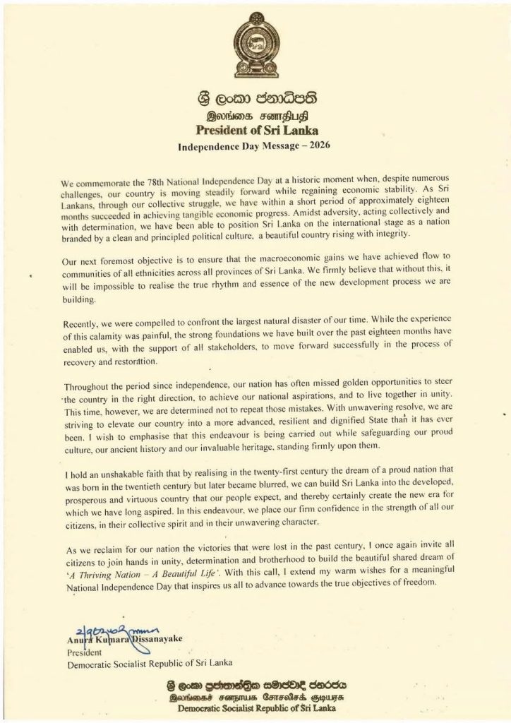 Message of the H.E.the President of Sri Lanka on the 78th Independence Day