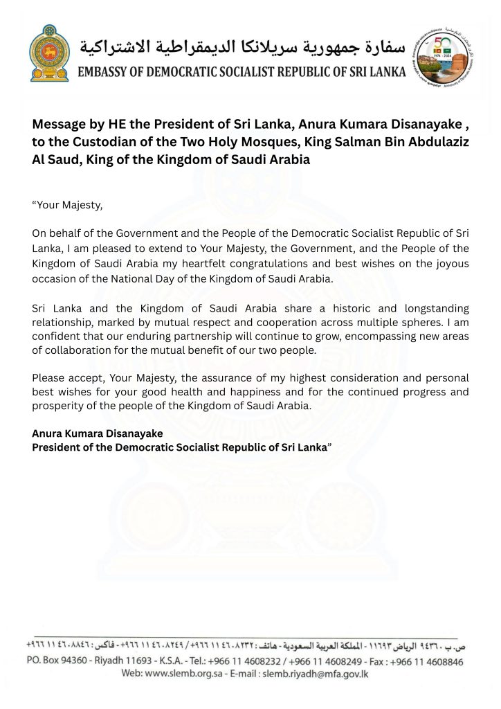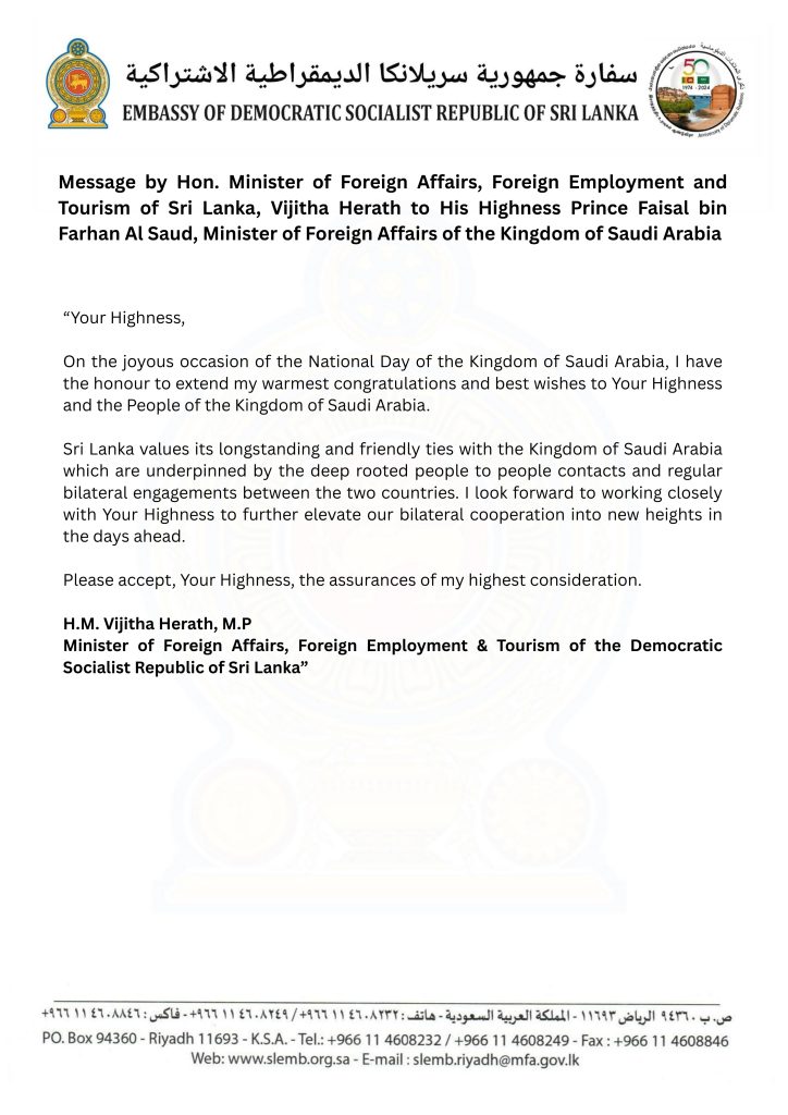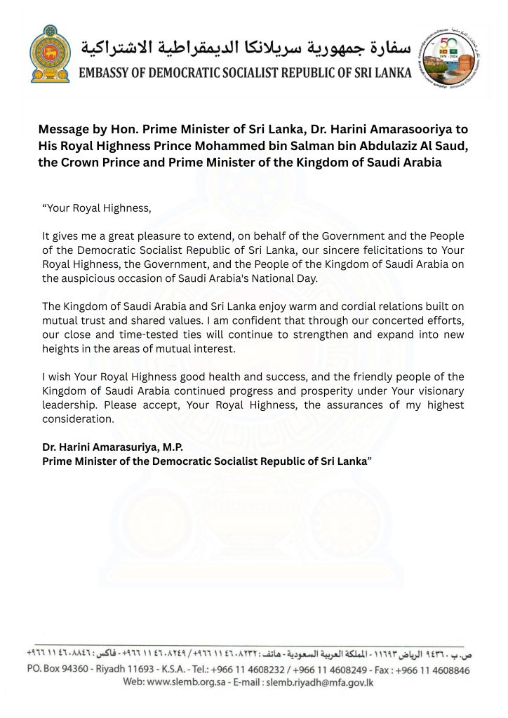 Happy National Day to the Kingdom of Saudi Arabia The messages issued by HE the President of Sri Lanka Anura Kumara Disanayake, Hon. Prime Minister of Sri Lanka Dr. Harini Amarasooriya and Hon. Minister of Foreign Affairs, Foreign Employment and Tourism Vijitha Herath on the occasion of 95th National Day of the Kingdom of Saudi Arabia.