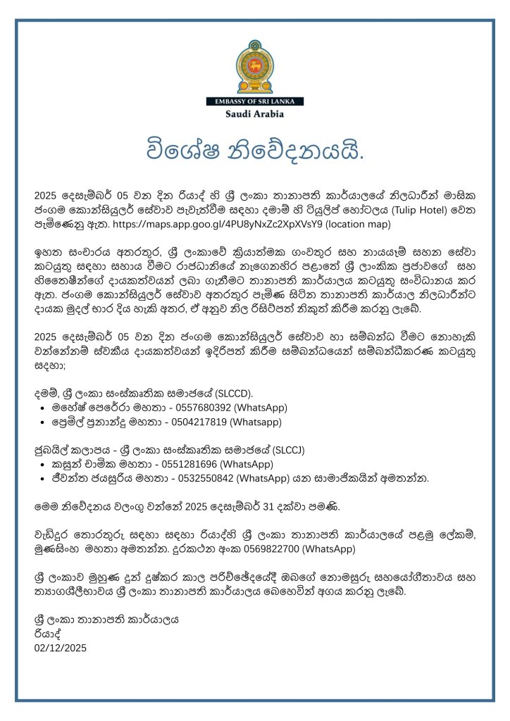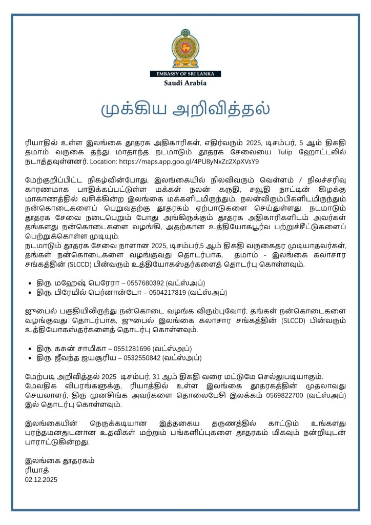Sri Lankan Community in Riyadh contributes 100,000 Saudi Riyals to the Emergency Flood Relief Fund December 6, 2025