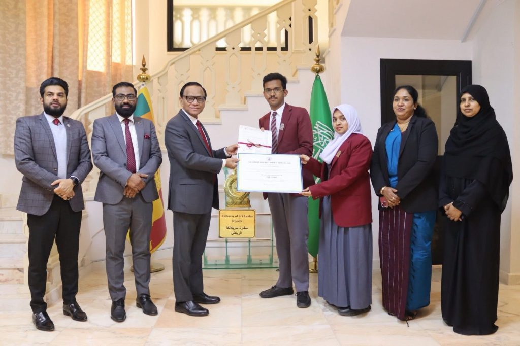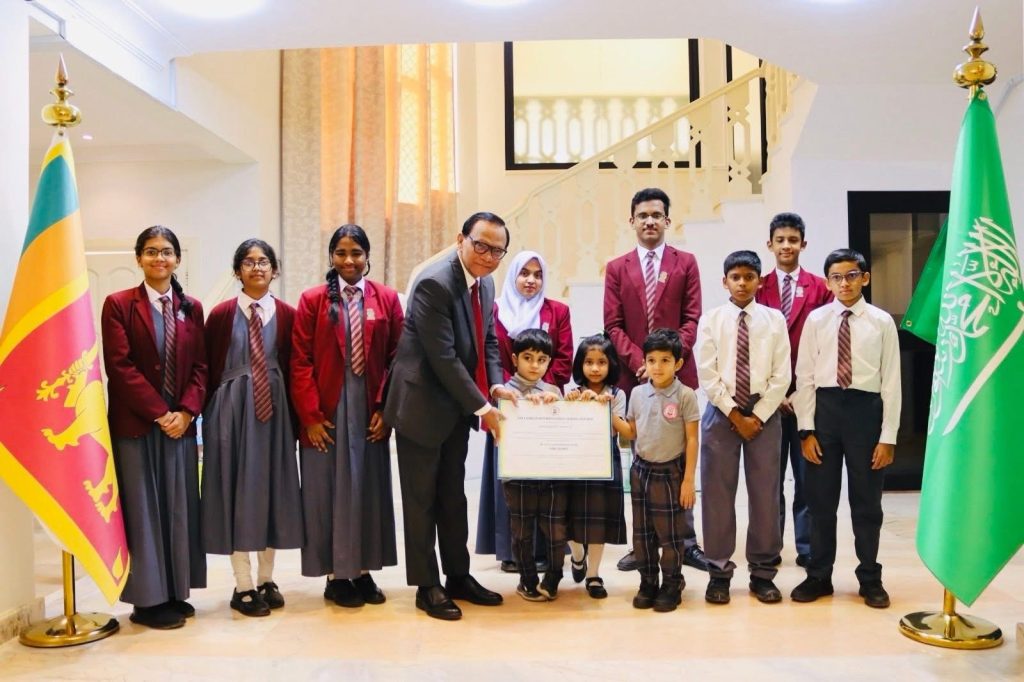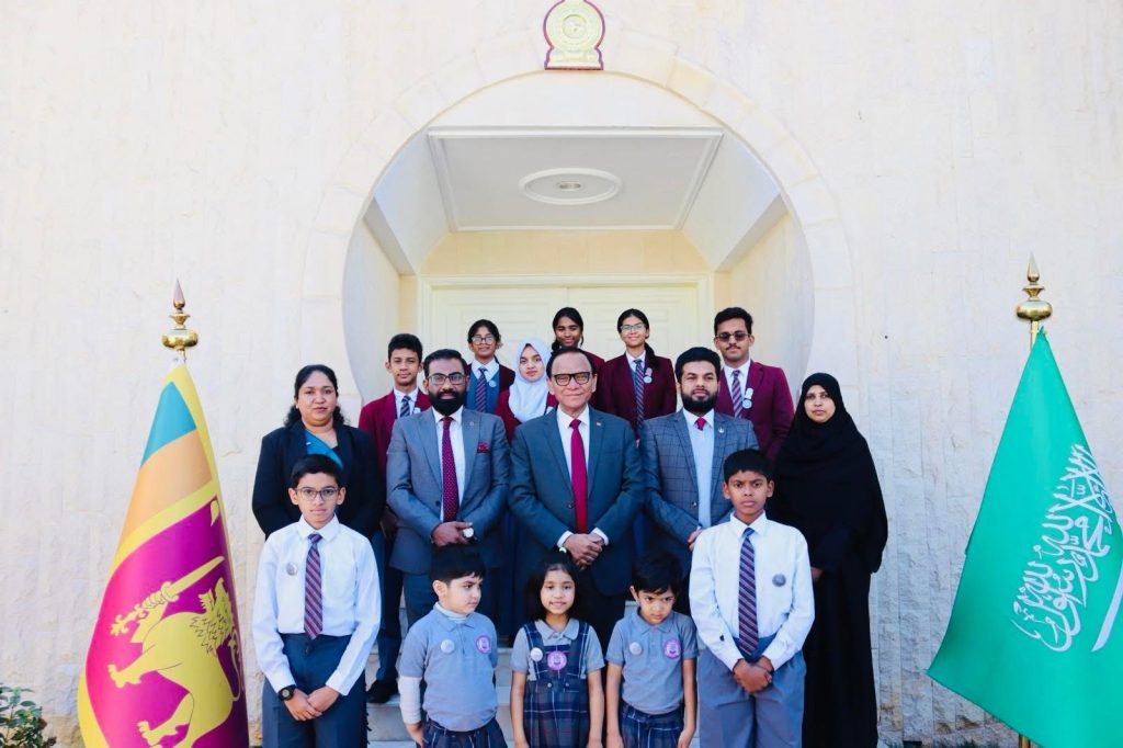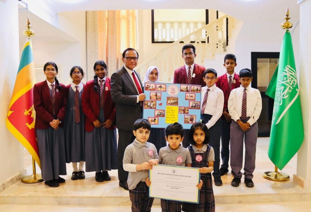 Students from Kindergarten to Advanced Level, representing multiple nationalities, came together with the School Principal and staff to hand over their contribution to Sri Lanka’s Ambassador to the Kingdom of Saudi Arabia, Ameer Ajwad, at the Embassy premises in Riyadh on 17.12.2025.