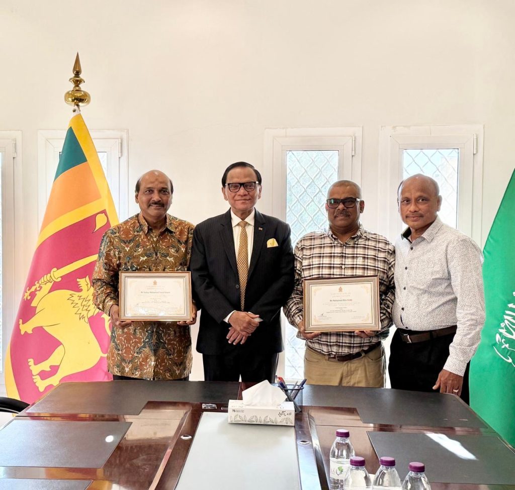 சவுதி அரேபியாவில் நீண்ட காலம் பணியாற்றிய இரண்டு இலங்கைத் தொழிலாளர்களுக்கு ரியாதிலுள்ள இலங்கைத் தூதரகம் பாராட்டு