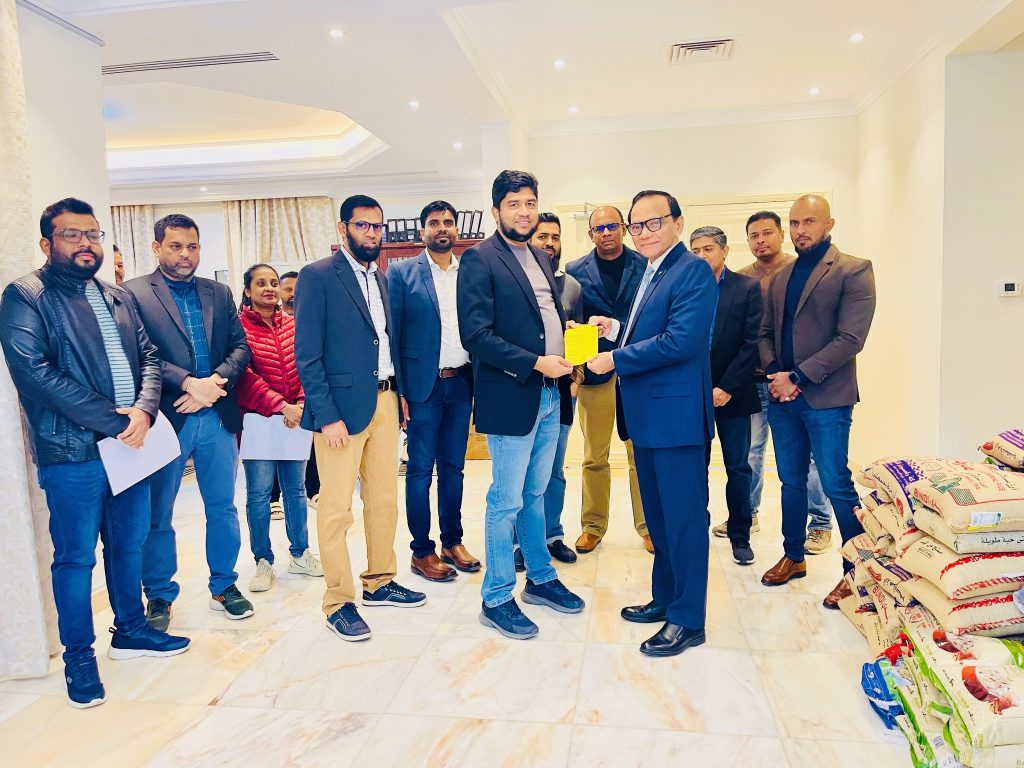 Representatives of SLQS-KSA, including members of the QS Cricket Club (Golden Gladiators), met with the Ambassador of Sri Lanka to the Kingdom of Saudi Arabia, Ameer Ajwad, at the Embassy premises in Riyadh on 20 December 2025, and officially handed over the financial contribution along with a consignment of dry rations.