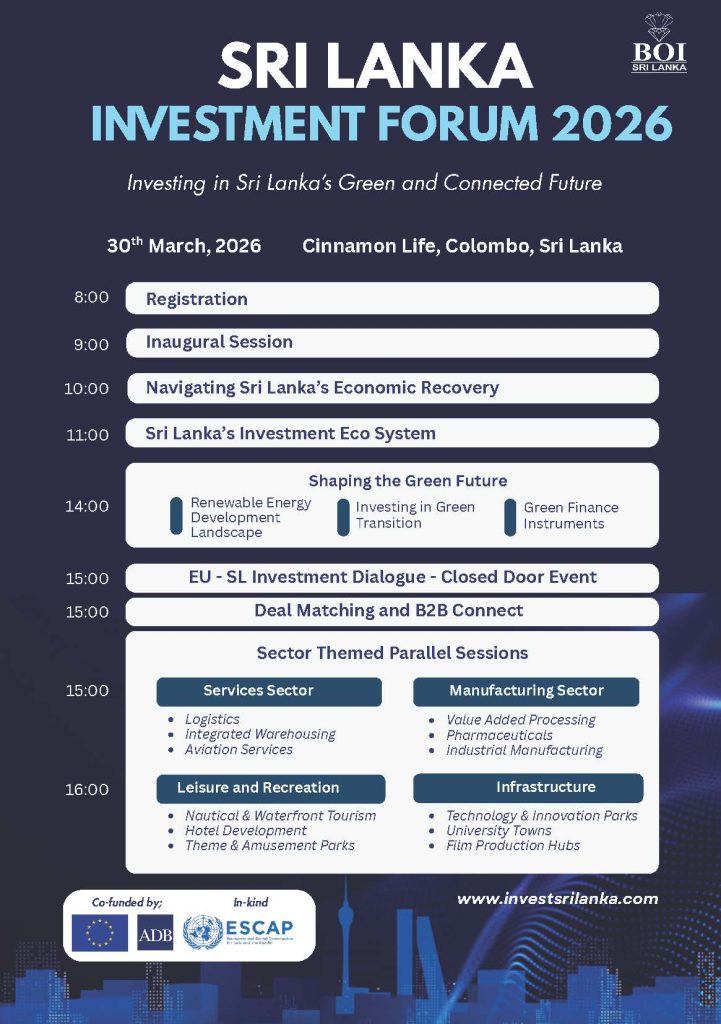 The Board of Investment of Sri Lanka (BOI), in collaboration with the European Union, Asian Development Bank (ADB), and United Nations ESCAP, is proud to present the Sri Lanka Investment Forum 2026.