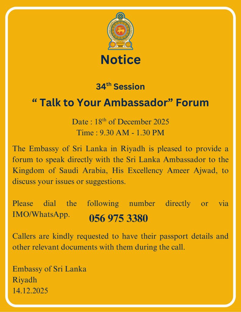 The Embassy of Sri Lanka in Riyadh wishes to inform the Sri Lankan community and all well-wishers in the Kingdom