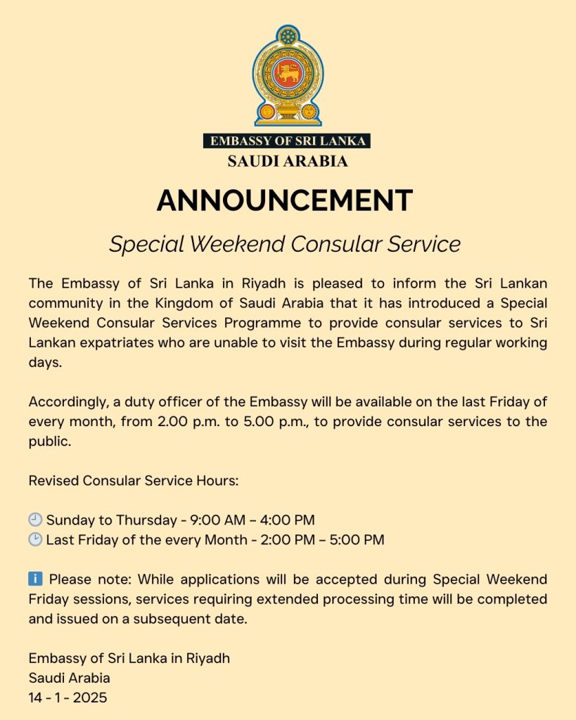 The Embassy of Sri Lanka in Riyadh cordially invites all Sri Lankans in the Kingdom of Saudi Arabia who are